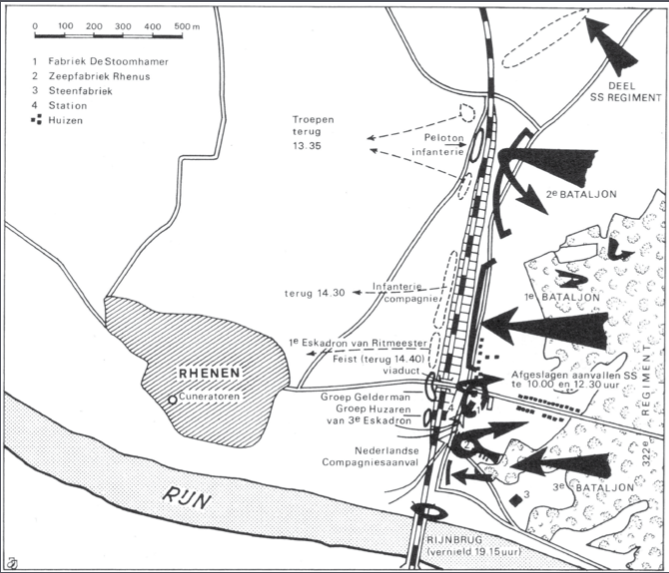 Ten noorden van het viaduct naderden inderdaad delen van het 1e bataljon van dit regiment de spoorlijn. Ook ten zuiden van de weg Wageningen-Rhenen bereikte een bataljon de spoorlijn en bezette ondermeer de zeepfabriek ‘Rhenus’. Delen van de eskadrons van 4RH namen hierop rond 12.30 op bevel van de regimentscommandant achterwaarts gelegen opstellingen in.
