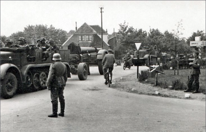 ….Am 15. Mai wird das Regiment DF alarmiert. Der Kommandierede General des X. Armee-Korps, General Hansen, hat den weiteren Vormarsch der 207. Division angehalten und befohlen daß das Regiment das zuerst die IJssel-Stellung und als einziges Regiment die Grebbe-Linie bis Rhenen durchbrochen hat, nun auch als erstes Regiment den weiterem Vormarsch durch Holland durchführen soll. Von Amerongen antretend, marschiert dat Regiment um 10.00 Uhr über Utrecht, Amsterdam nach Harlem, wo es die Küstensicherung bij IJmuiden und Zandvoort übernimmt.