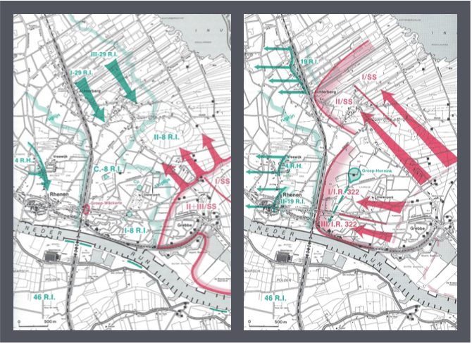 “09.30 Uhr: Auftrag: I./LAH übernimmt den Schutz der rechten Flanke durch Vorgehen auf Bennekom. Aufklärung hat Feind zwei Kilometer nordostwärts Bennekom festgestellt. Mit einem Stoß des Gegners aus nördlicher Richtung in die Flanke des Regiments DF muß gerechnet werden. I./LAH folgt dem Angriff des Regiments bis an den Ostrand des Waldes ostwärts Bennekom und bleibt dort zur Verfügung des Regiments liegen. Trotz hartnäckigen Widerstand der Holländer im unübersichtlichen Gelände ist Wageningen gegen 11.00 Uhr vom Regiment DF genommen. Um dieses Zeit is auch dat I./LAH ohne Feindberührung am befohlenen Ort, Waldrand ostwärts Bennekom, angekommen.”