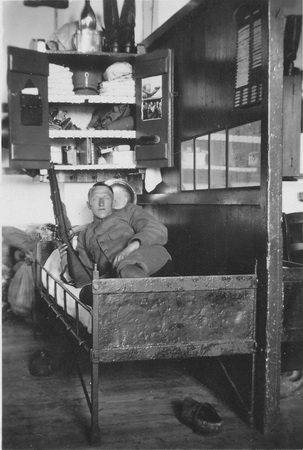 1939 slaapplaats Boreelkazerne Deventer, Arnoldus Hondelink met karabijn.