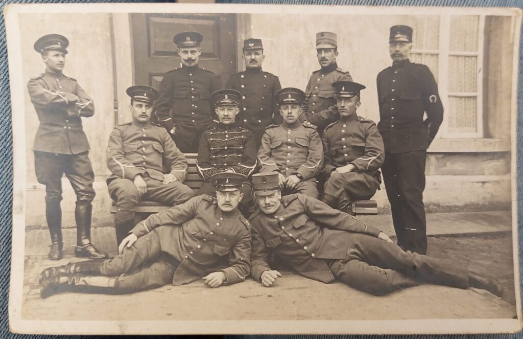 Op de foto rechts een aantal beroepsonderofficieren van de 4 regimenten van de cavalerie in diverse tenues rond 1914-1918, (na invoering van de kepie in 1916).