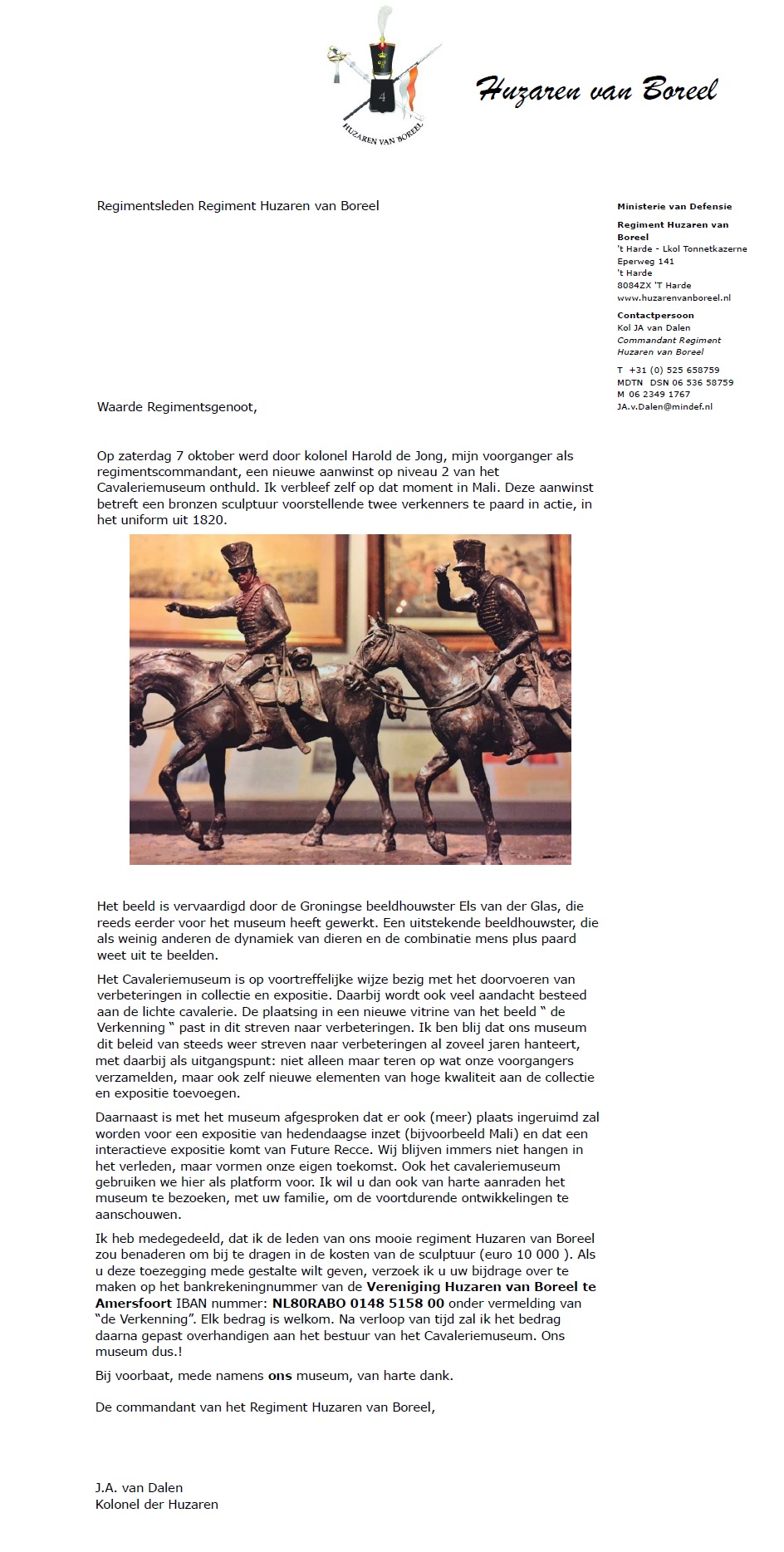 Zie hieronder de oproep van onze Regimentscommandant m.b.t. ondersteuning voor het beeld “De Verkenning”