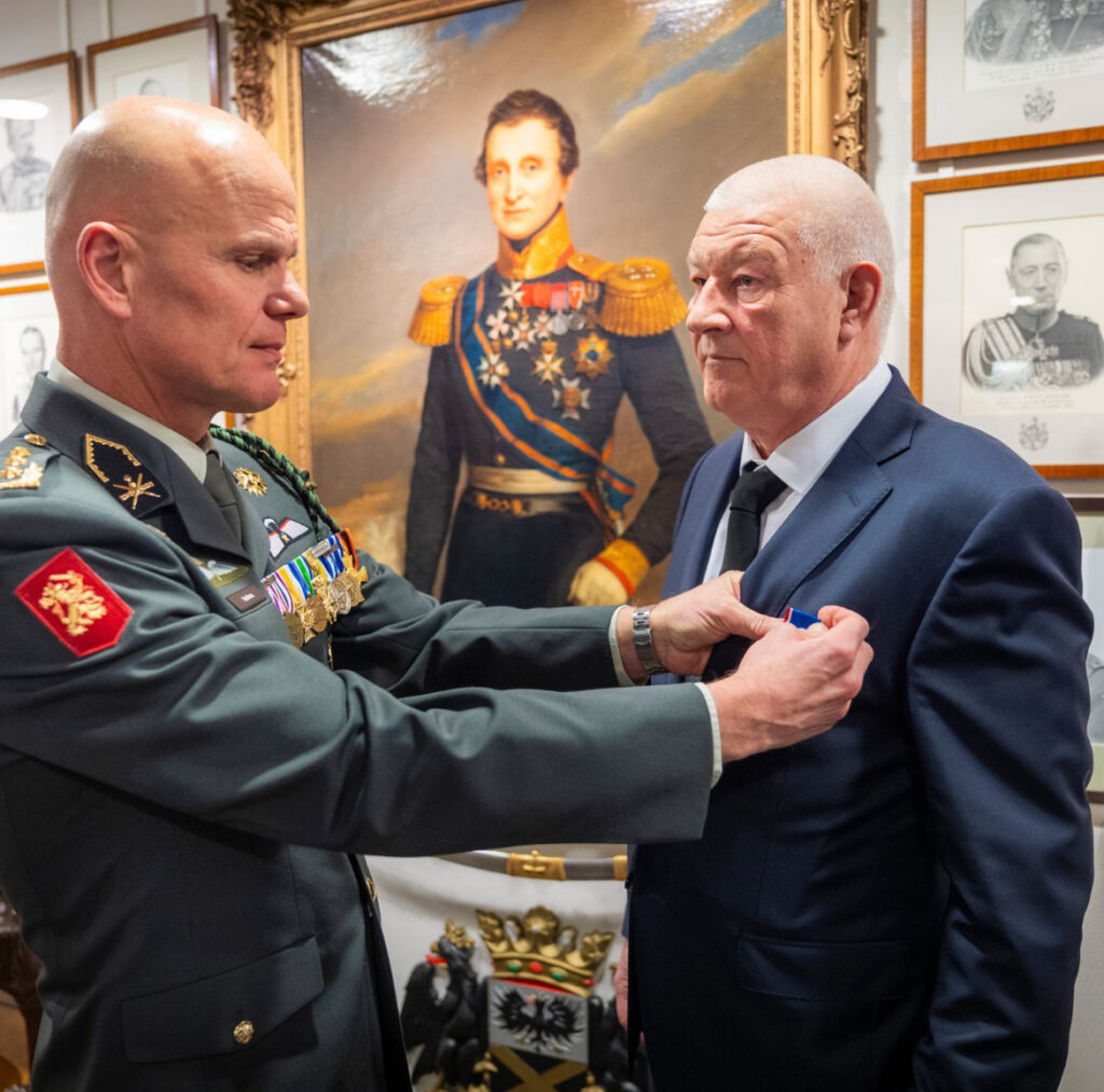 Een bijzonder moment op de Kromhout Kazerne. Daar ontving opperwachtmeester b.d. Geert de Groot maandag het Ereteken van Verdienste in Brons en de Sculptuur Operationeel Optreden uit handen van de Commandant Landstrijdkrachten, luitenant-generaal Swillens.