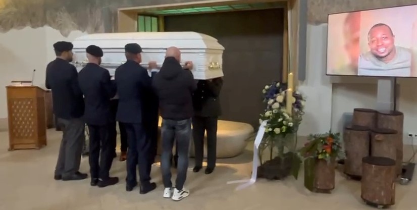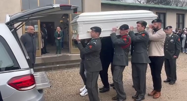Op verzoek van zijn moeder (midden) met links zijn neef en rechts Stephens dochter, een foto met zijn kameraden die hem begeleiden naar zijn laatste rustplaats.