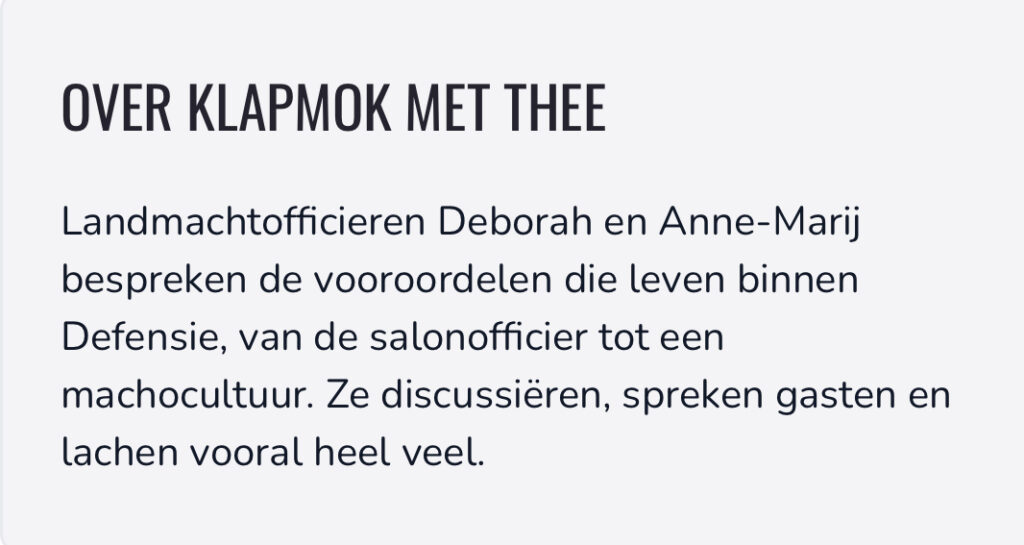 De koning en de koningin zijn weer samen, het is zelfs een hele familie die weer compleet is. We krijgen namelijk weer tanks! Deborah en Anne-Marij gaan hierover in gesprek met oud Boreel-officier Lkol Bas Schillemans, commandant 414 Tankbataljon en nu commandant van de eFP Battlegroup in Litouwen.
