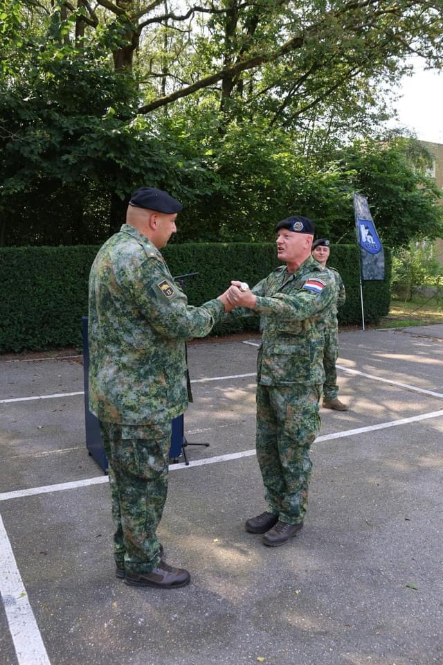 De oude EA werd in het zonnetje gezet door de eenheid maar ook door CLAS, generaal Swillens, die vanmorgen de legpenning in goud aan Johan overhandigde. Johan heeft deze verdiend door zijn tomeloze inzet voor zowel het eskadron als ons Regiment. (Foto’s 42BVE)”