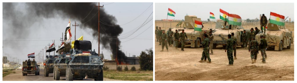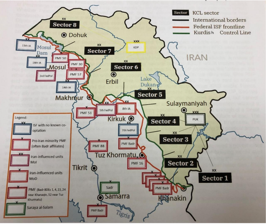 Koerdische KDP en PUK-sectoren ten noorden van de KCL en Soennitische (ISF) en Sjiitische (PMF) eenheden zuid van de KCL