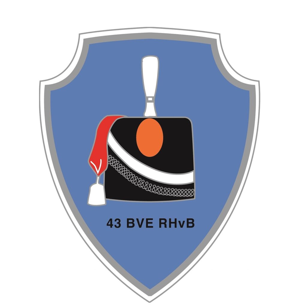 De specifieke cavalerie kolbak op een licht blauw veld verwijst naar de oorsprong van 43 ZVE (Huzaren van Boreel). Ontworpen door dpl huzaar Stoffels (eerste geschilderde exemplaar door dpl huzaar Zwakenberg).