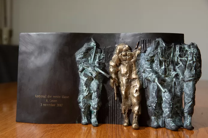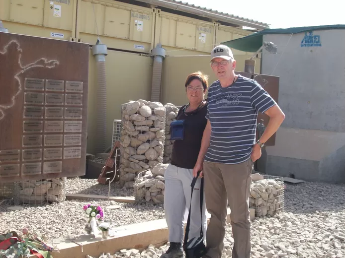 In Kamp Holland slapen vader en moeder in de container waar hun zoon ook verbleef, eten ze in de eetzaal waar hun zoon had gegeten. ,,Ik wilde alles meemaken’’, zegt Hans. ,,Zette speciaal de wekker om te kunnen zien hoe de zon daar op komt.’’ Een paar dagen verblijven ze in het kamp, de reis maakt een diepe indruk op het echtpaar. Ze mogen een plaquette meenemen, die in Kamp Holland stond ter ere van hun zoon. Ook die staat nu in een vitrine in de woonkamer in Epe. Net als de baret van Ronald en een Afghaans hoedje dat hij voor zijn vader had gekocht. ,,Dat zat in zijn plunjezak die mee terug kwam.’’