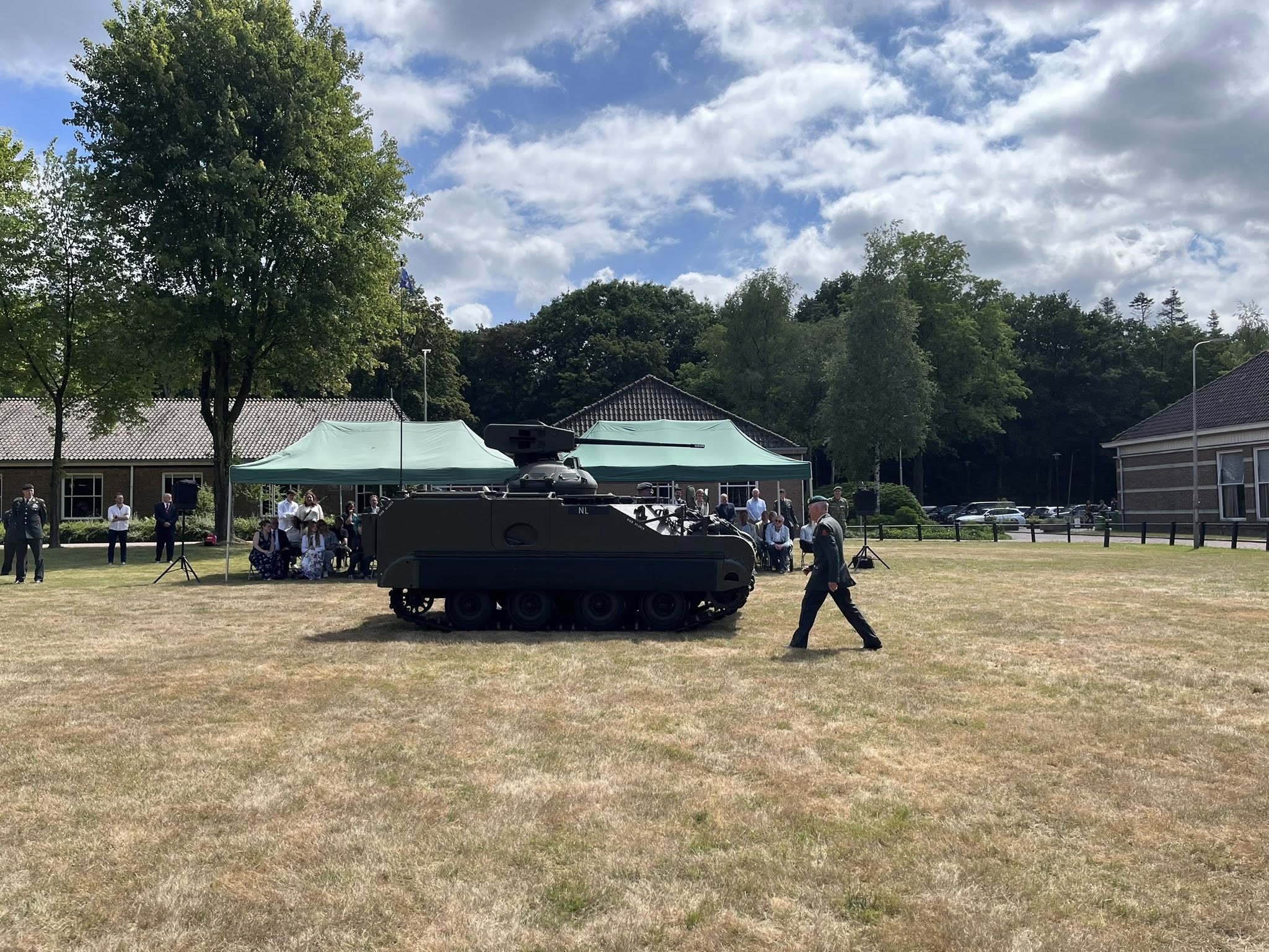 “Een droevige dag voor ons Regiment Huzaren van Boreel. Oud RHB icoon kolonel Frank Overdiek heeft het uniform uitgetrokken. Als goedmakertje mochten we wel genieten van het unieke geluid van een M113 C&V. Gelukkig kon het plantsoen van de Bernhard kazerne ertegen…” aldus kolonel Hans van Dalen.