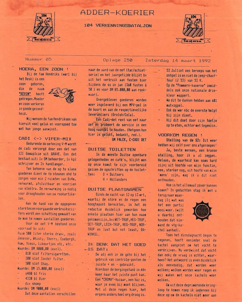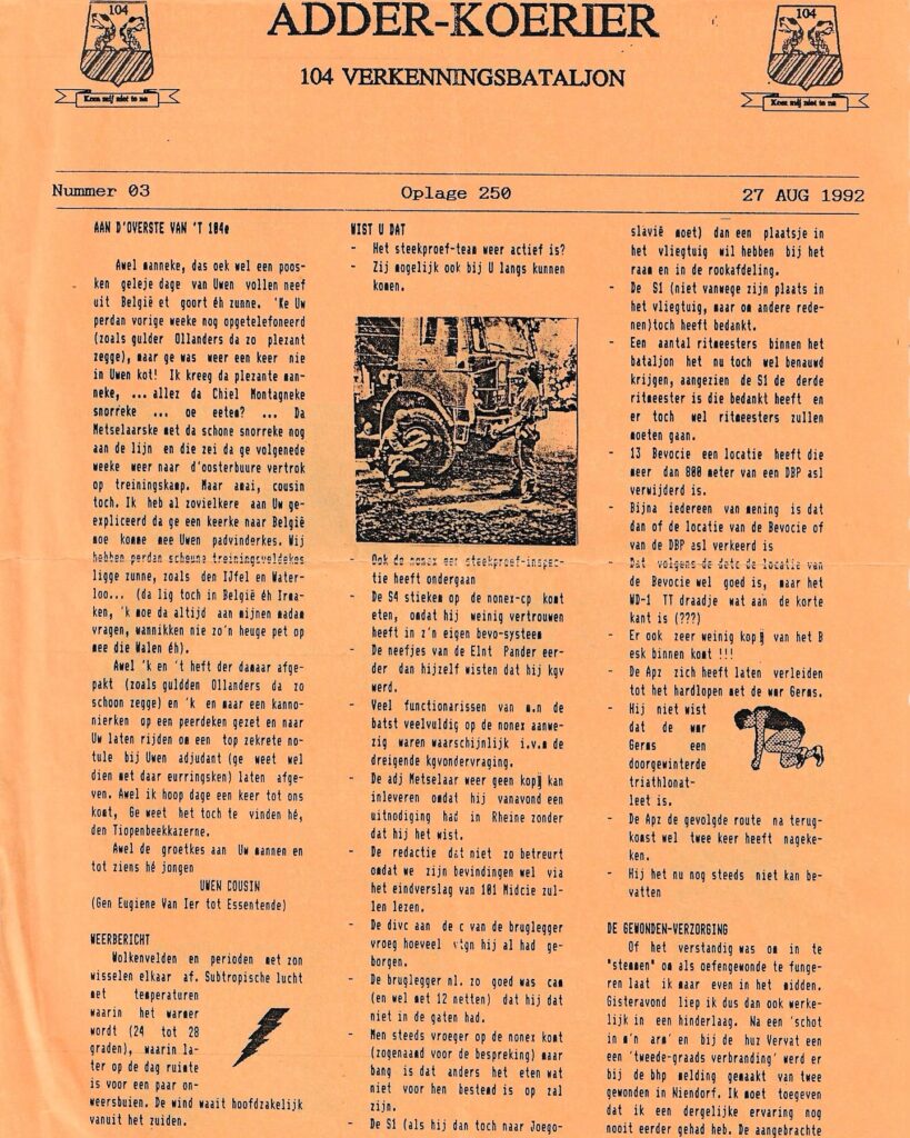Om de geschiedenis van het Adderbataljon dat op de Generaalmajoor Winkelmankazerne in Nunspeet gehuisvest was vast te leggen in een herinneringsboek missen wij nog veel informatie over het destijds daar als beroeps én dienstplichtige personeel, de oefeningen en de anekdotes.